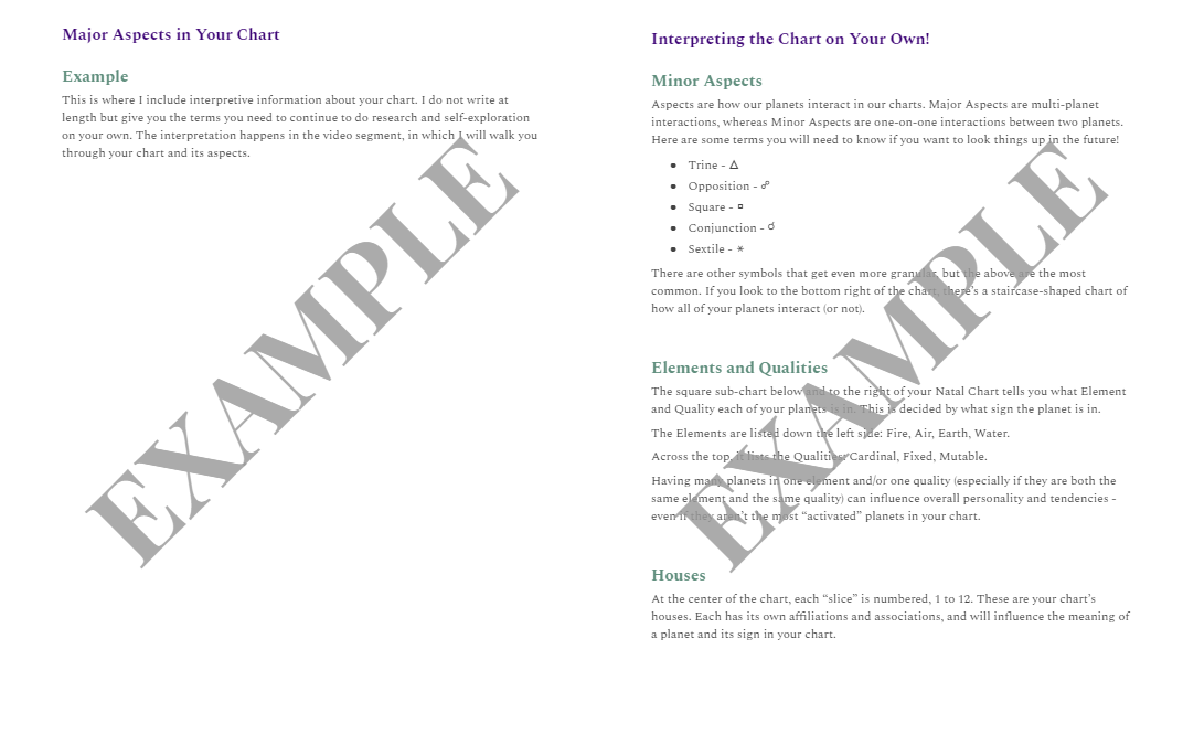 Included in the price of this reading, you also receive a PDF document which includes the image of your chart, delineates each placement, and includes a guide on how to read astrological symbols.