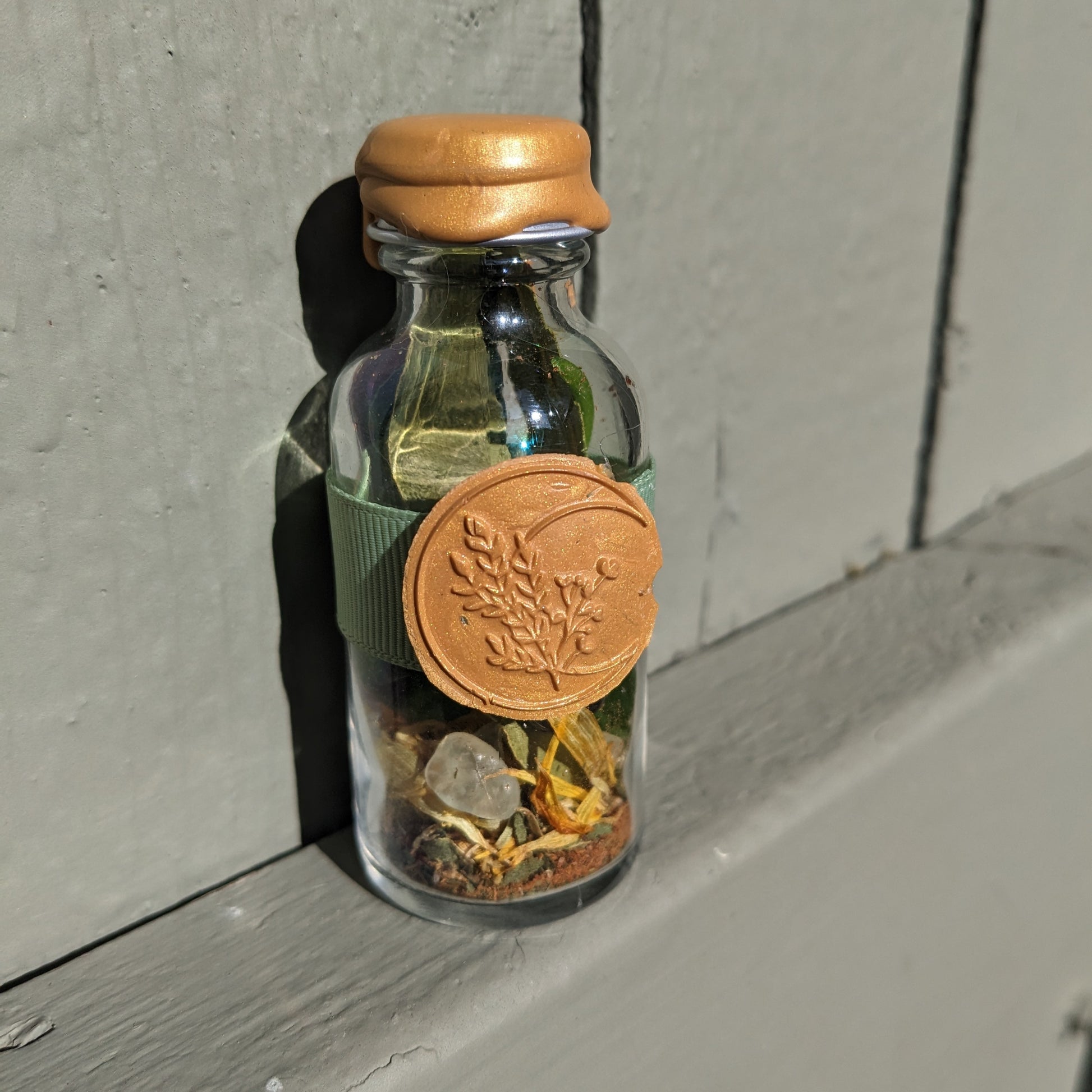These jars are 1 oz., glass, and are made with herbs, crystals, ribbon, and wax. Each jar comes with a list of which items I used and who I called upon to help me craft the jar for you.